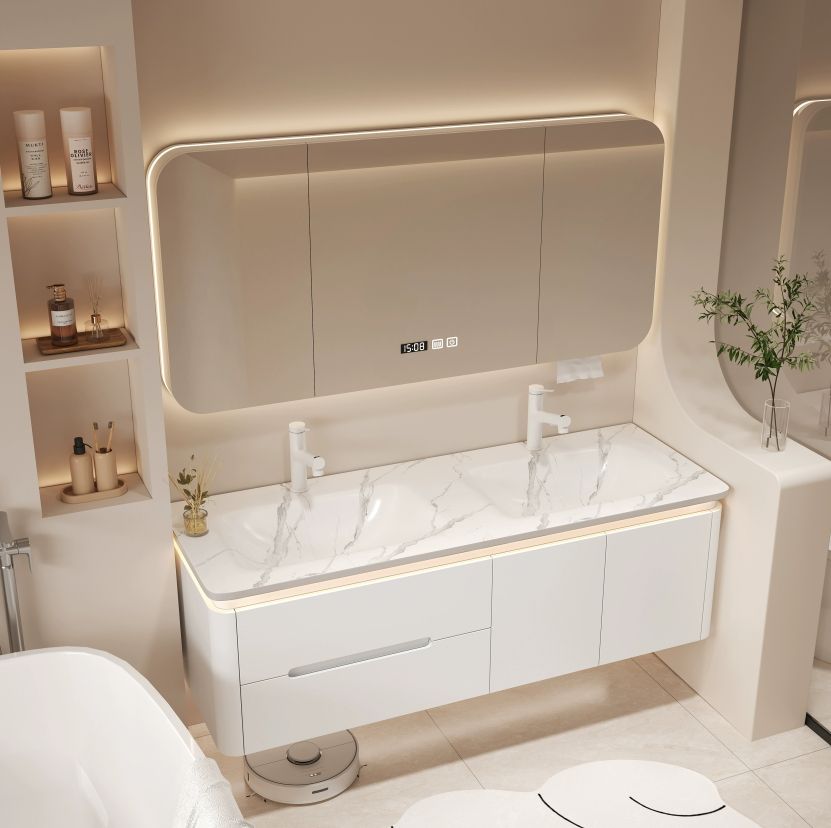 Cream Wind Rock Plate Hot Bending One Double Basin Bathroom Cabinet Combination Bathroom Basin Cabinet Customization