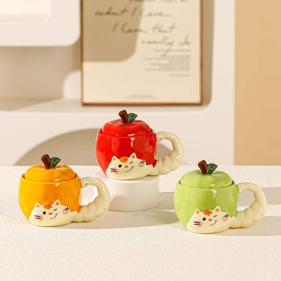 Product Name:Funny Apple shape with cat pattern ceramic coffee mug set