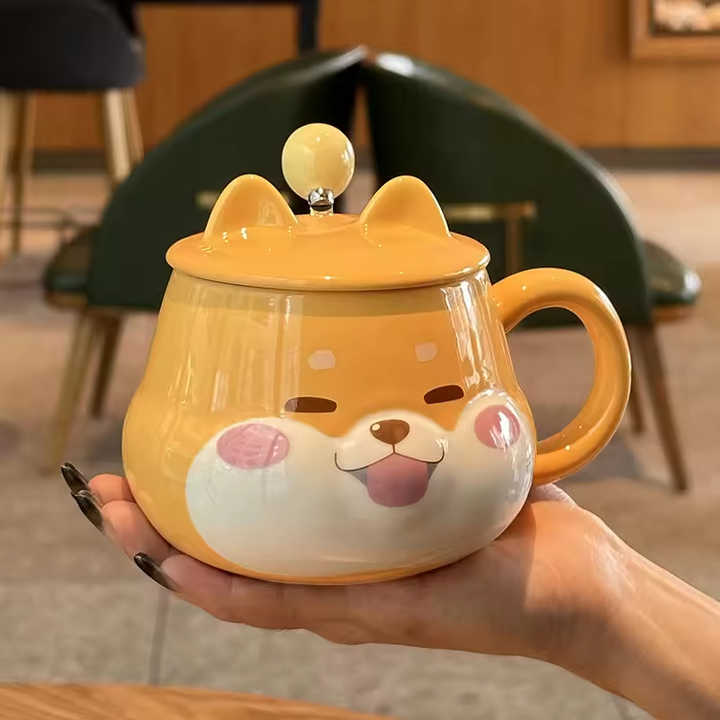 Creative Design Ceramic Coffee Mug Cartoon Dog Shape Rounded Handle Lid Spoon-Cute Halloween Style Dishwasher Microwave Safe