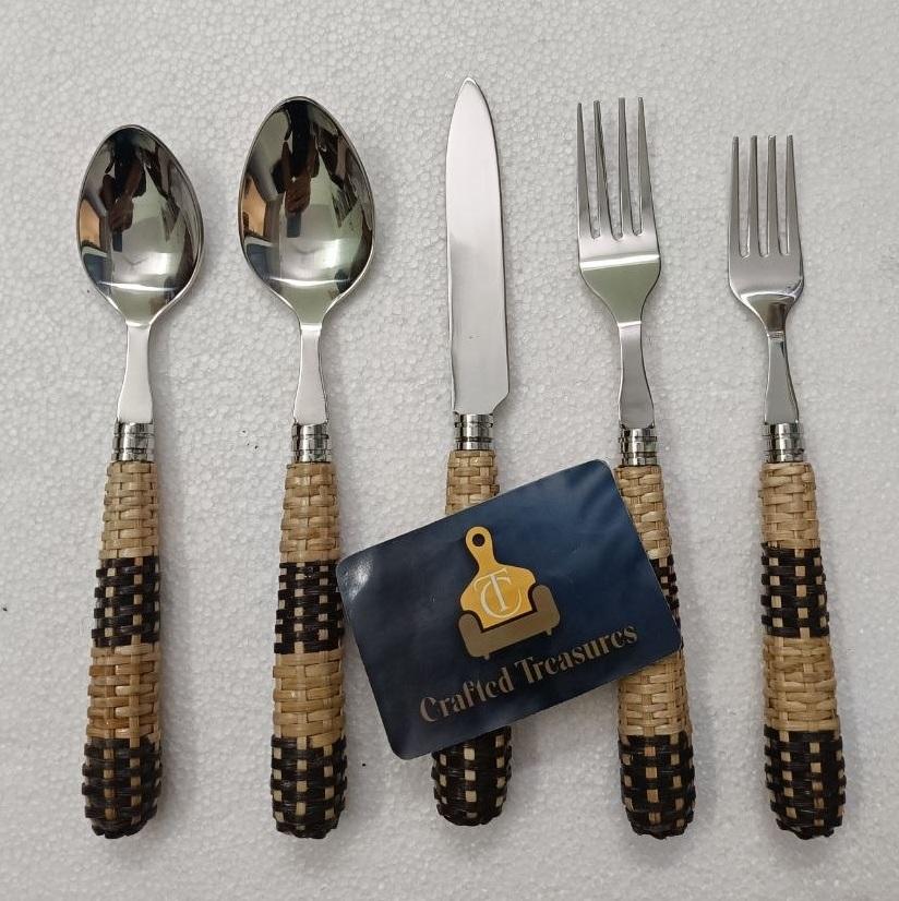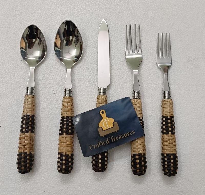 Creative Design Rattan woven Handle Flateware Set 18/8 Stainless Steel 5-Piece Set Mirror Polish Durable Eco-Friendly Utensil