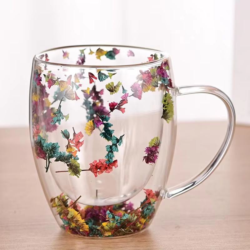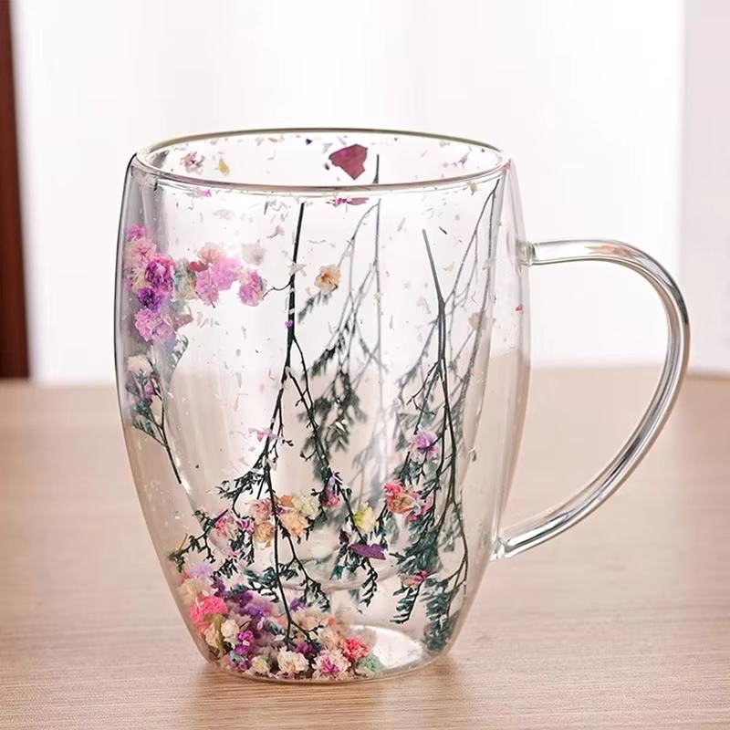 Creative Eco-Friendly Bohemian Double Wall Glass Coffee Mug with Real Dried Flower Filler Heat Resistant Handles & Party Gift