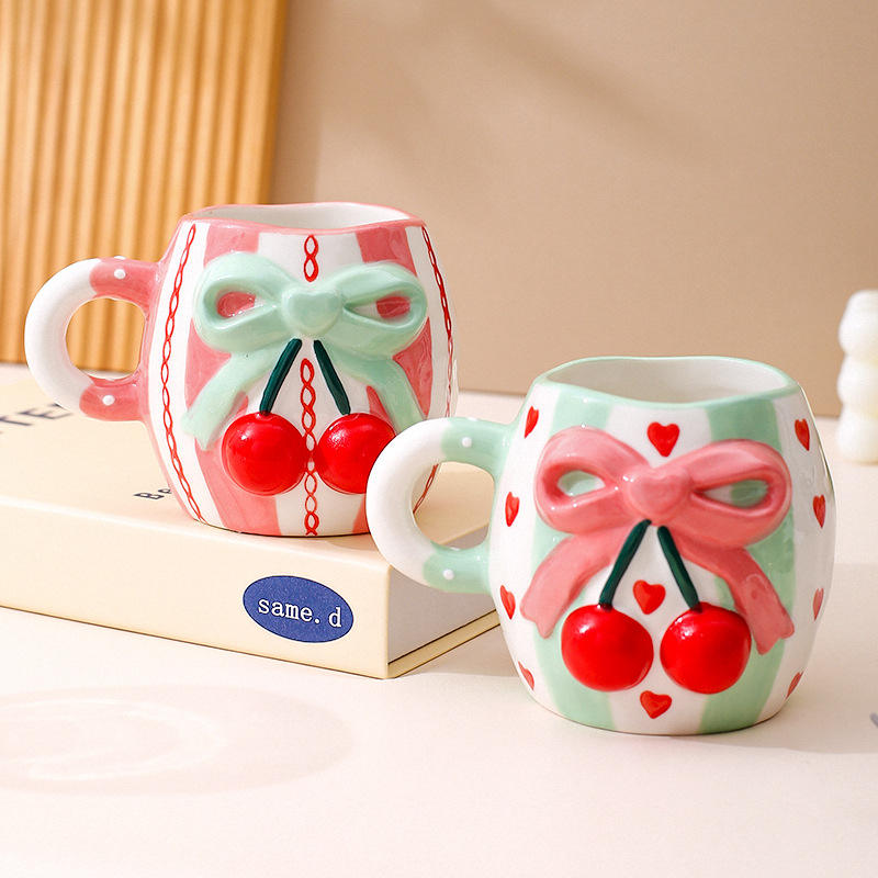Creative Embossed 3d Cherry Ceramic Coffee Cup Cute Bow Tie Ceramic Mug for Girls
