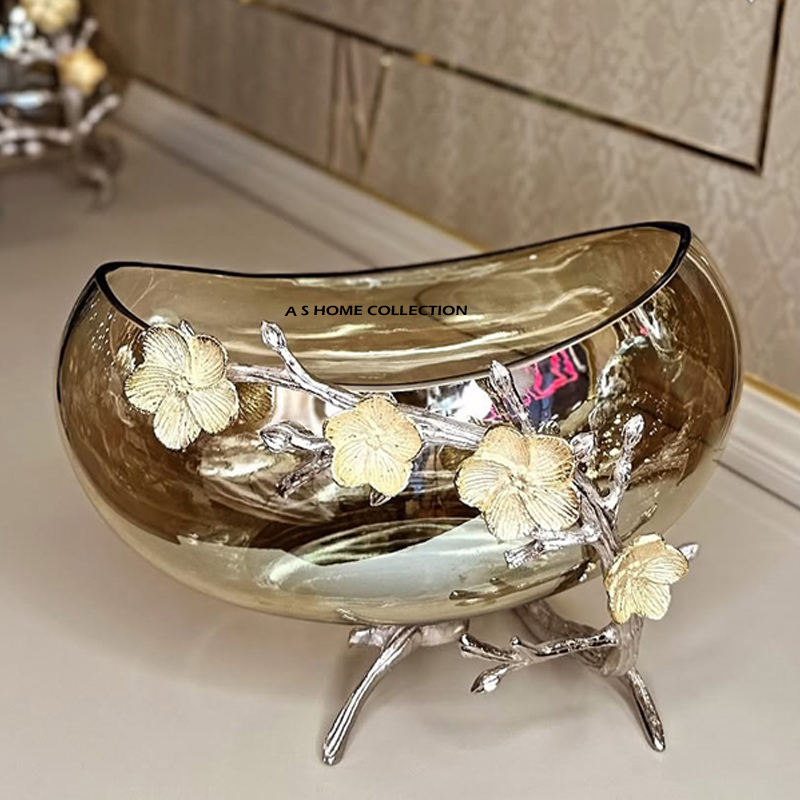 Creative Glass Bowl With Tree Branch Shape Gold Flower Design Stand Aluminum Metal Decorative Serving Bowl Wedding Food Storage