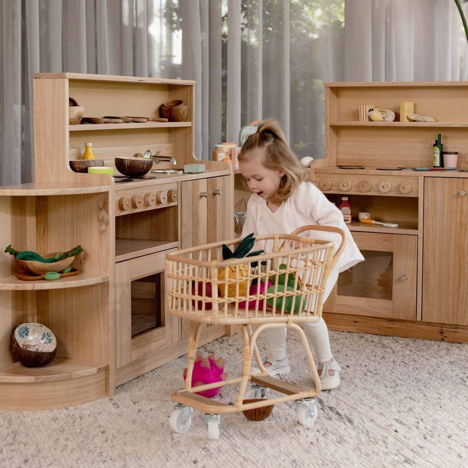 Creative Pretend Play Rattan Supermarket Shopping Cart for Kids Sturdy Durable Mini Shopping Carts