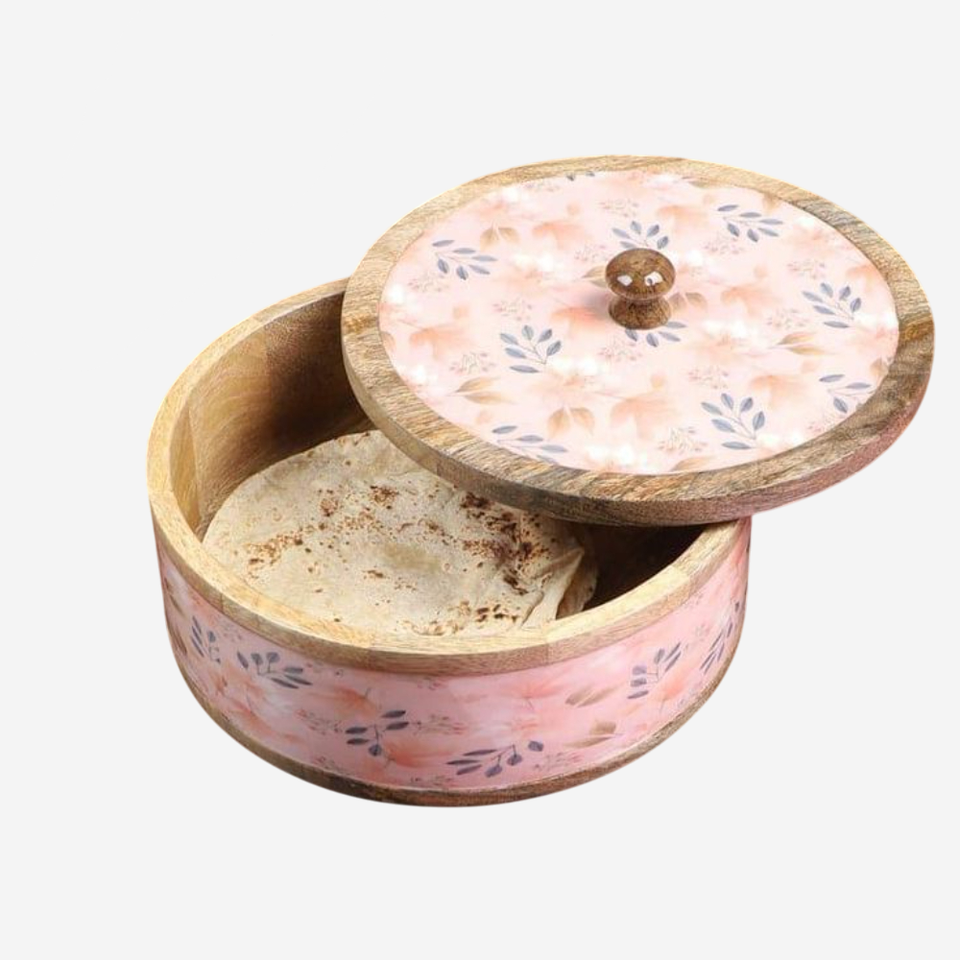 Creative Quality Handcrafted Mango Wood Floral Print Roti Box with Lid Ideal Chapati Casserole & Food Warmer Hot Pot