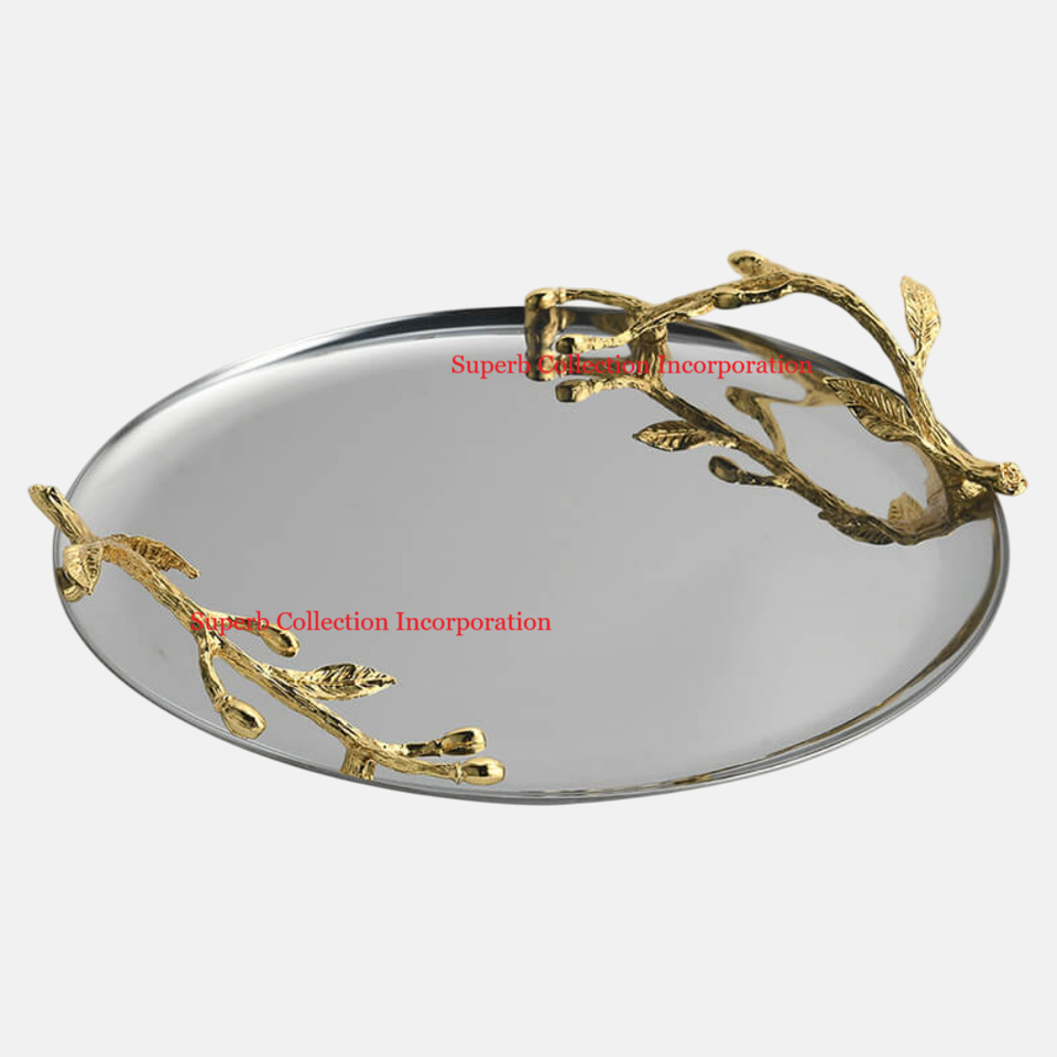 Creative Quality Metal Tray With Hammered Finish And Floral Gold Handles Luxury For Hotel Serving Or Special Events