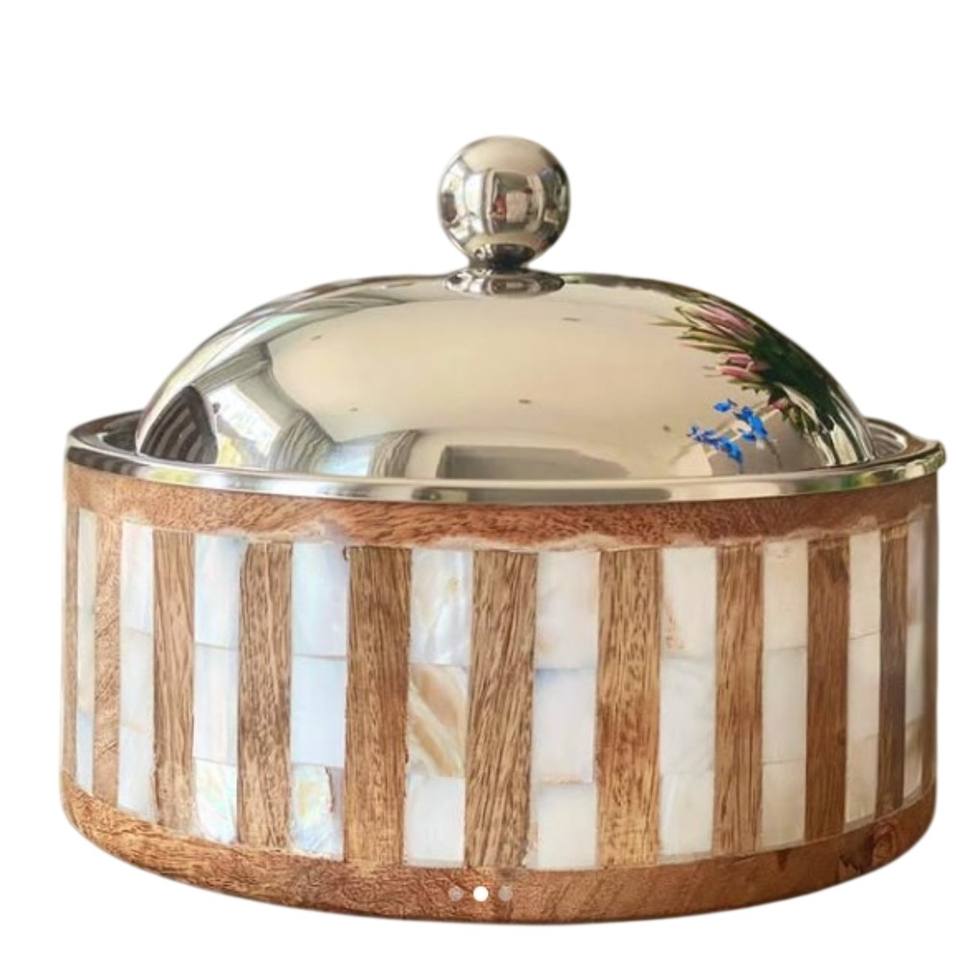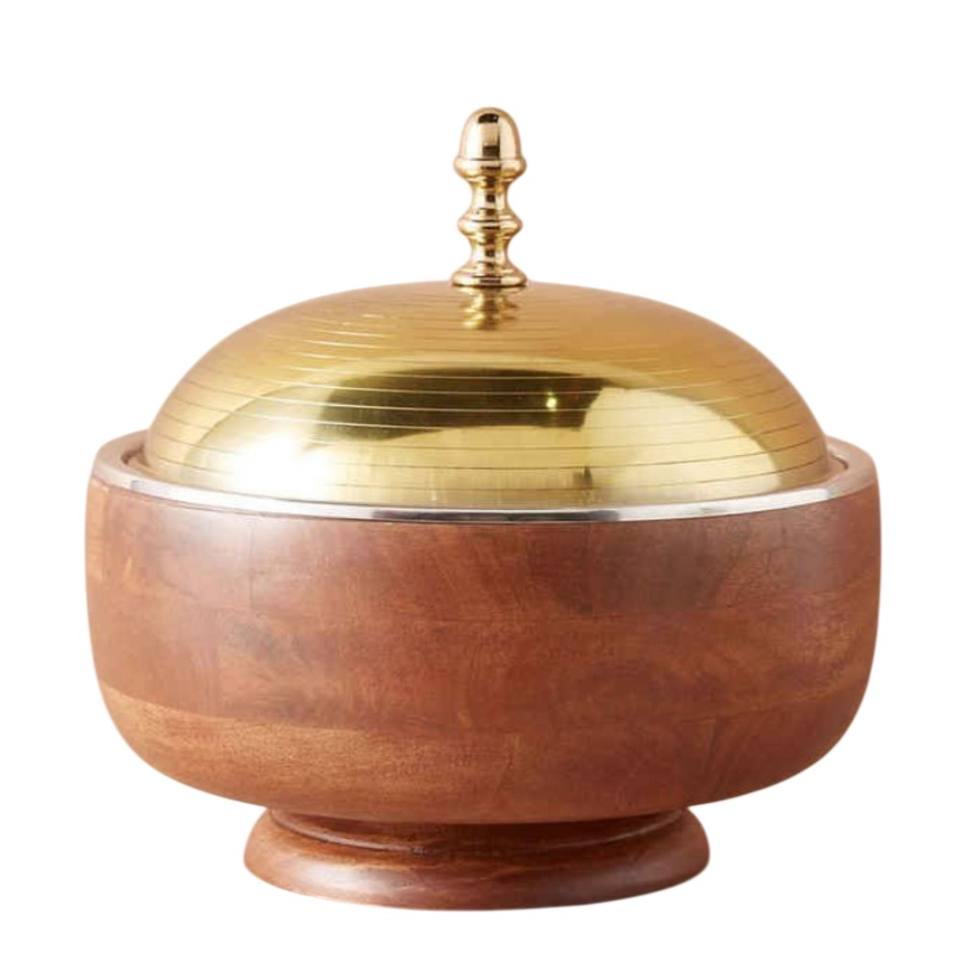 Creative Stainless Steel Hot Pot With Elegant Wooden Finish And Gold Handles Round Food Warmer Casserole Dish For Buffet Serving