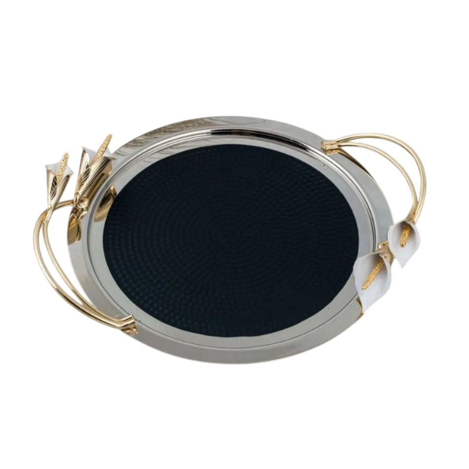 Creative Tableware Food Serving Tray Tea Coffee Serving Tray Stainless Steel Black Powder Coated Tray With Dahlia Design Handles