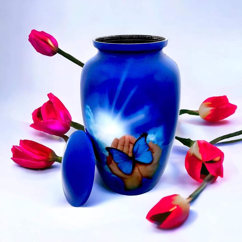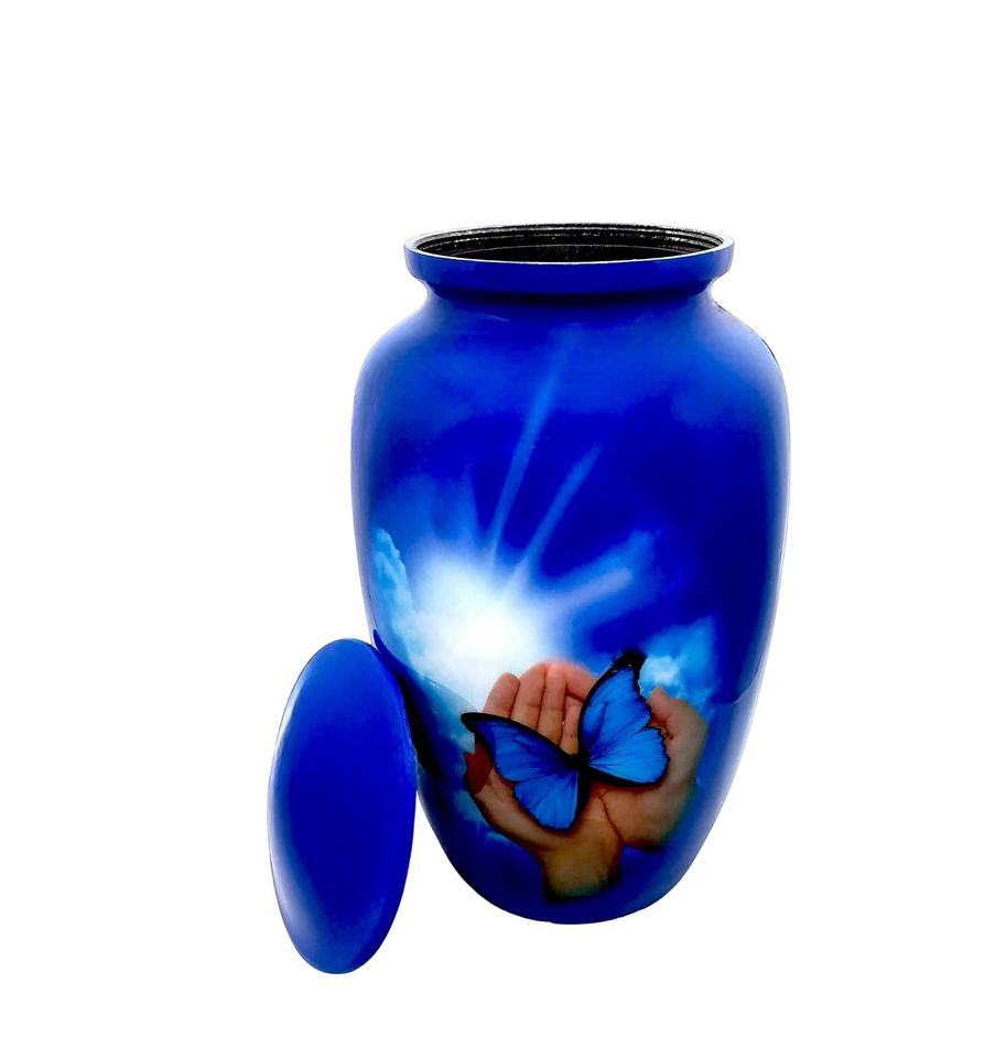 Cremation Urn Burial Lovely Hand Butterfly Design Large Size 26 cms high with Velvet Bag