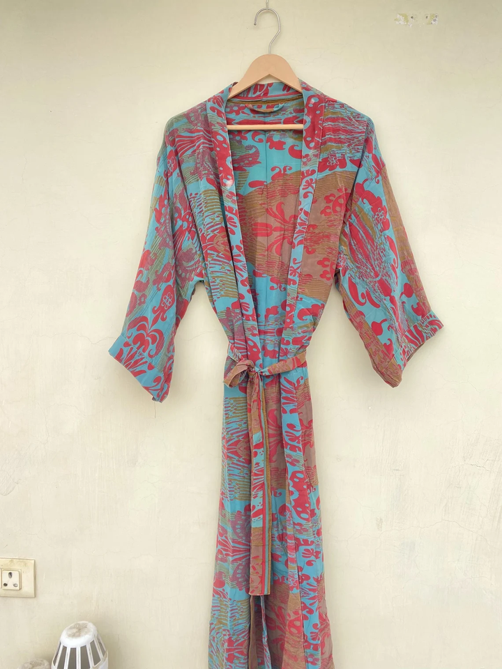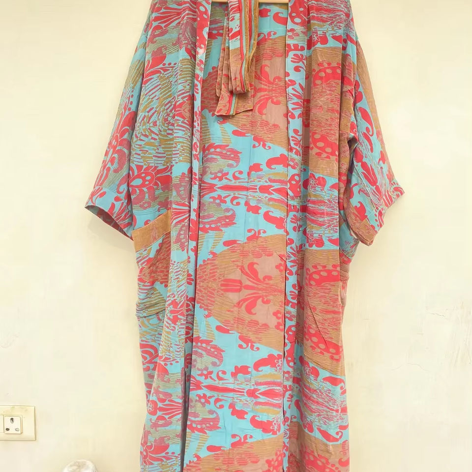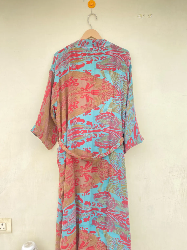 Crepe Silk Tie-Dye Kimono Robe 100% Silk Quick Dry Beach Cover-Up Night Dress Drawstring Closure Free for Summer Autumn Spring