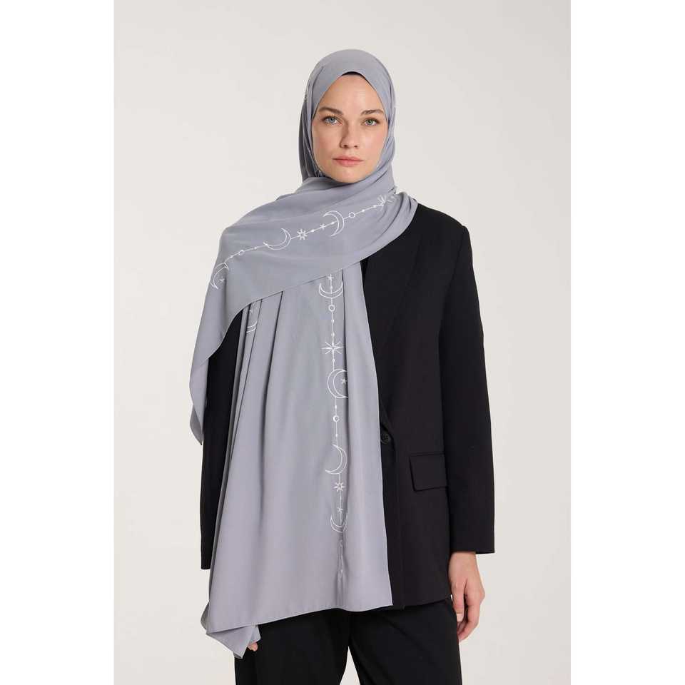 Crescent Weave Embroidered Shawl Grey Chiffon Women Breathable Islamic Scarf
