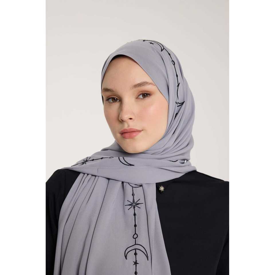 Crescent Weave Embroidered Shawl Grey Chiffon Women Breathable Islamic Scarf