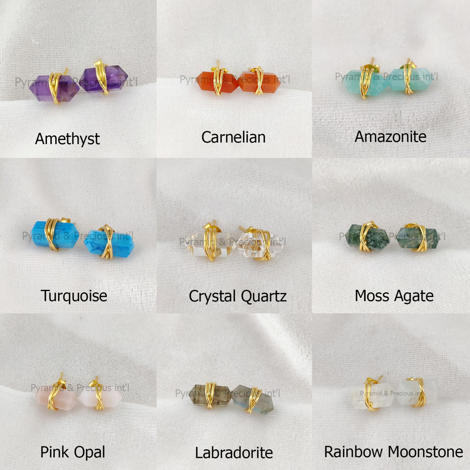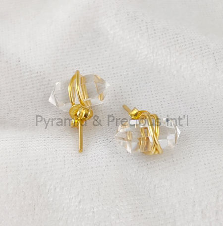 Cristal Quartz Double Side Pointed Central Drill Wire Wrapped 925SterlingSilver Gold Vermeil Butterfly Push Back Studs Earrings