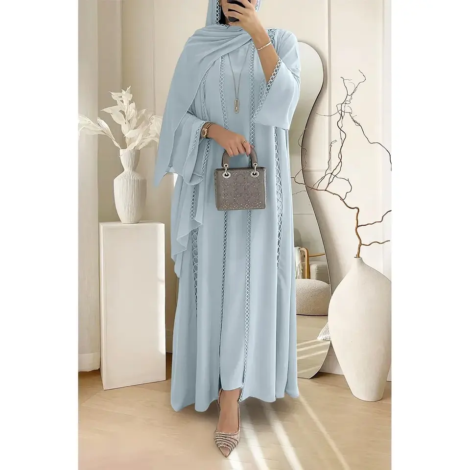 Crochet Breathable Long Sleeve Cardigan Maxi Dress Plain Abaya Matching Set in Chiffon Fabric for All Seasons