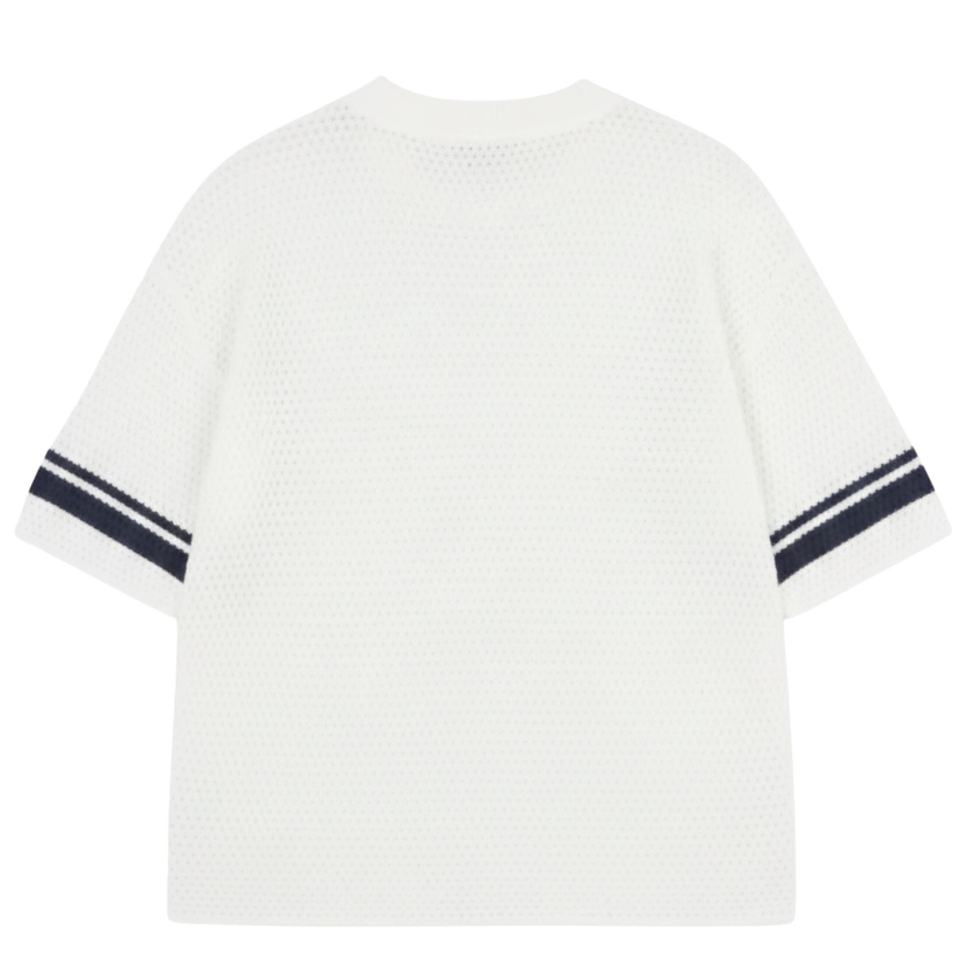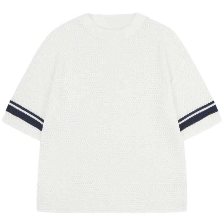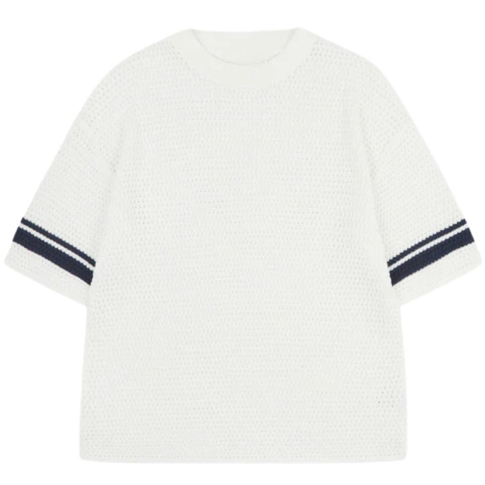 Crochet Knitted Contrast Stripe T-Shirt White Short Sleeve Textured Knit Summer Casual Breathable Crew Neck Top