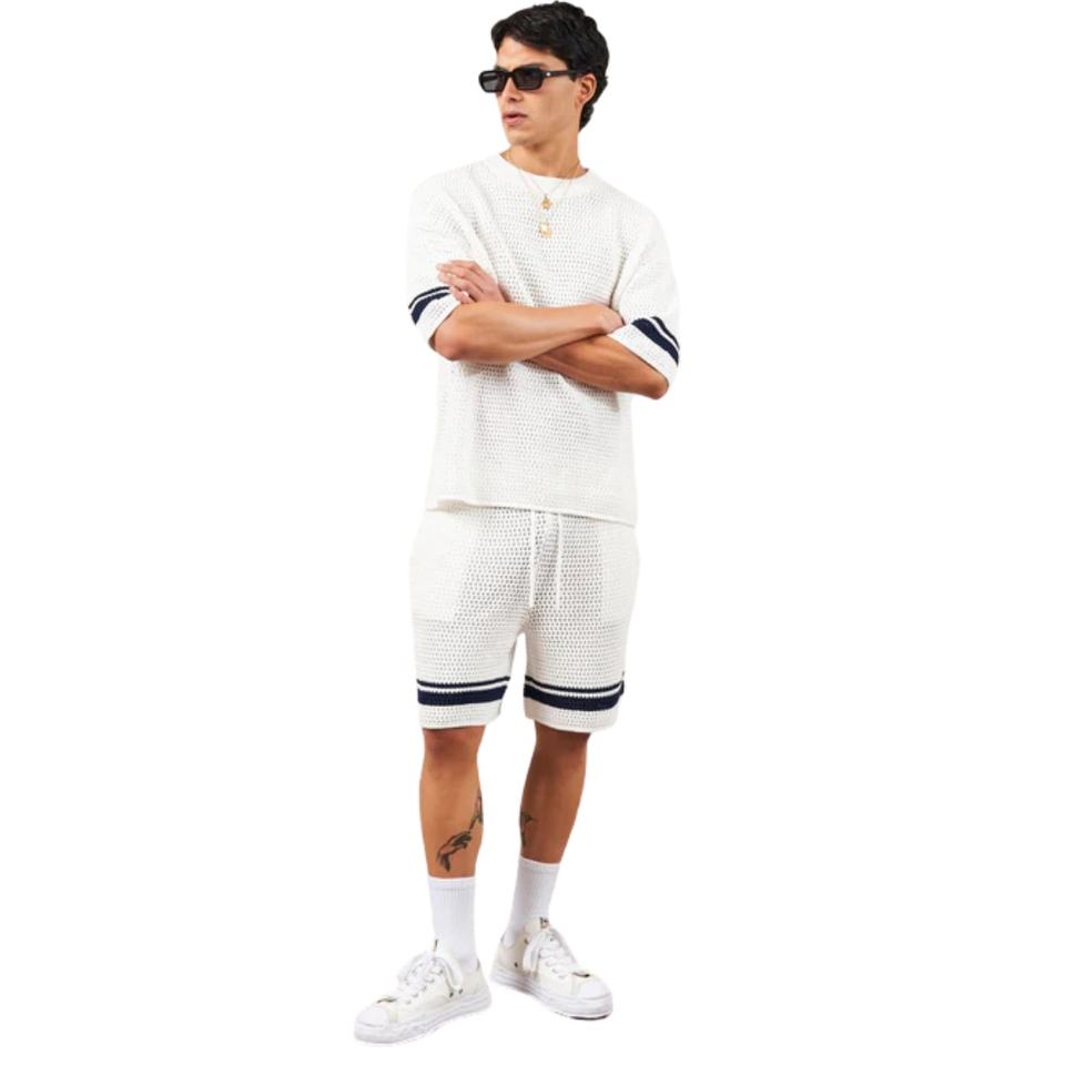 Crochet Knitted Contrast Stripe T-Shirt White Short Sleeve Textured Knit Summer Casual Breathable Crew Neck Top