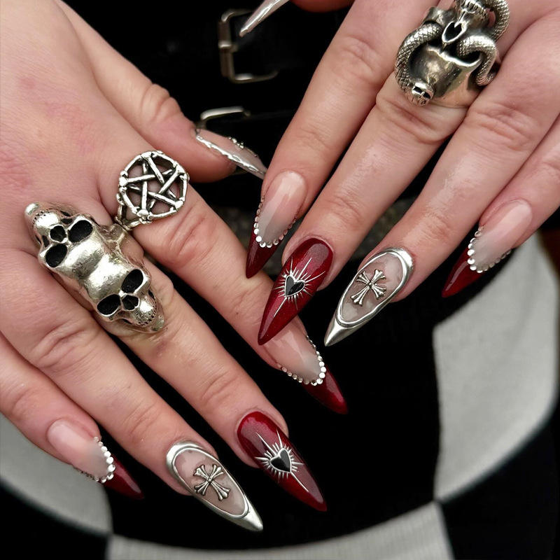 Cross-Border European and American High-End Handmade Rhinestone Nail Pieces Cross Dark Gothic Heart Wearable Fake Nails