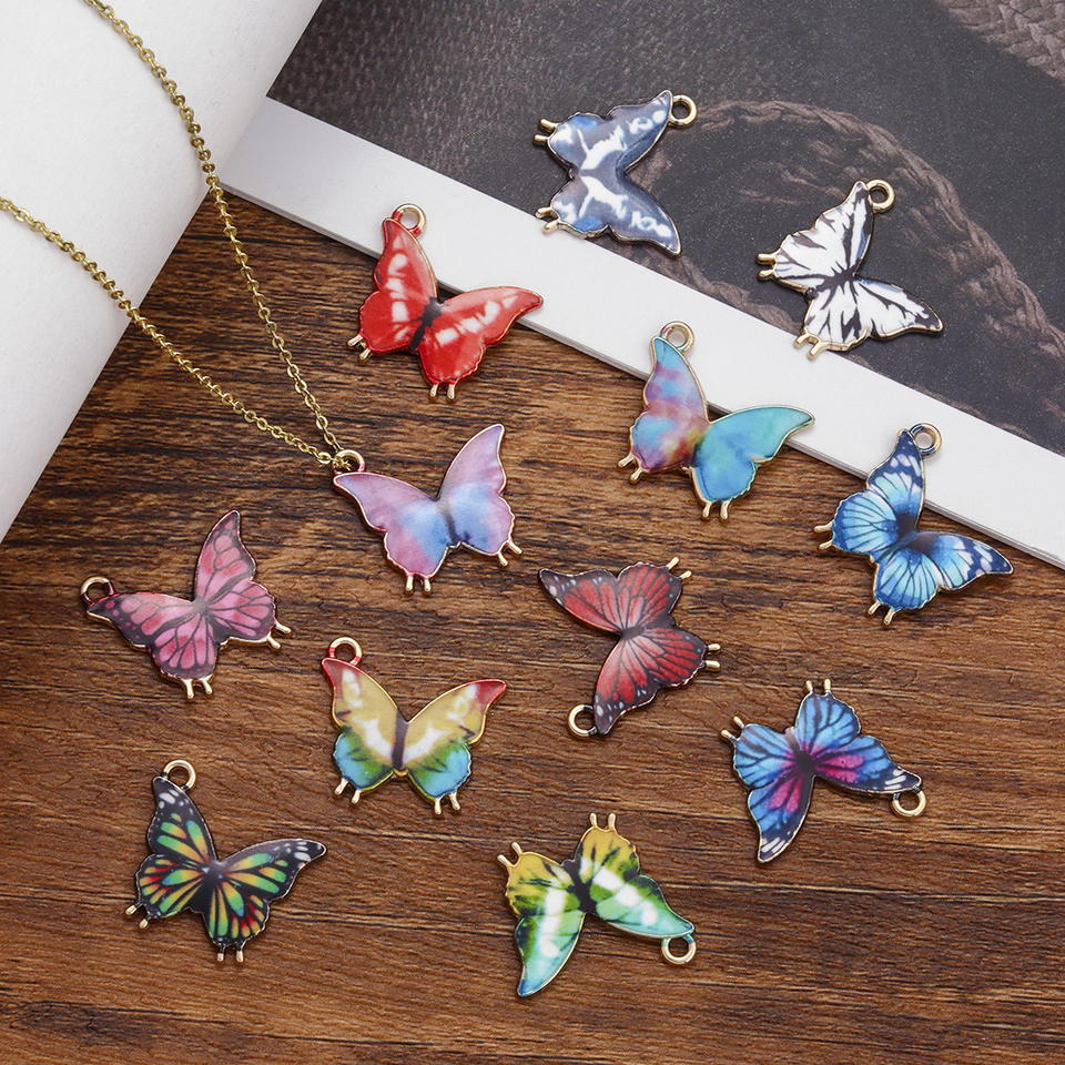 Cross-Border Hot Selling Colorful Printed Powder Butterfly Alloy Jewelry Accessories Gold Keychain Necklace Pendant Hanging