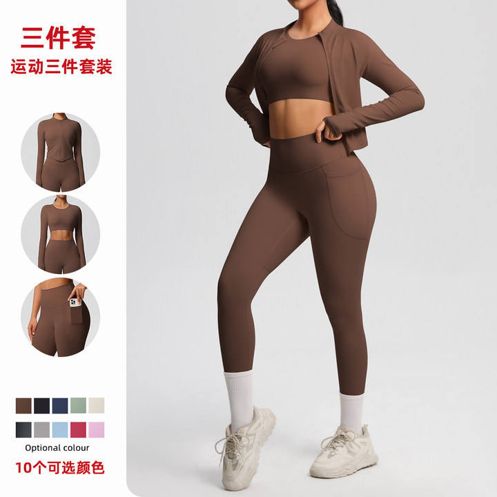 Cross-Border New Cloud-Feeling Sports Jacket Slim-Fit Long-Sleeved Hip-Lifting Effect Peach Fitness Yoga Suit Three-Piece Set