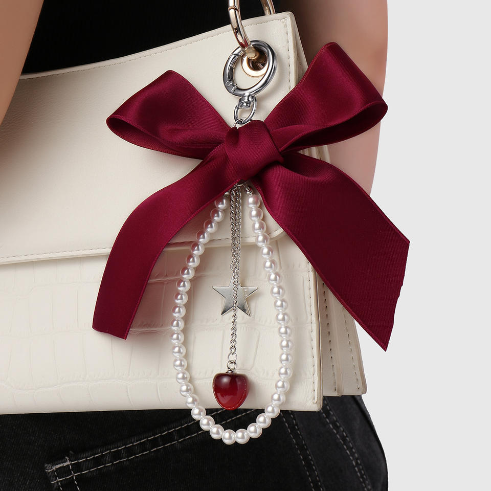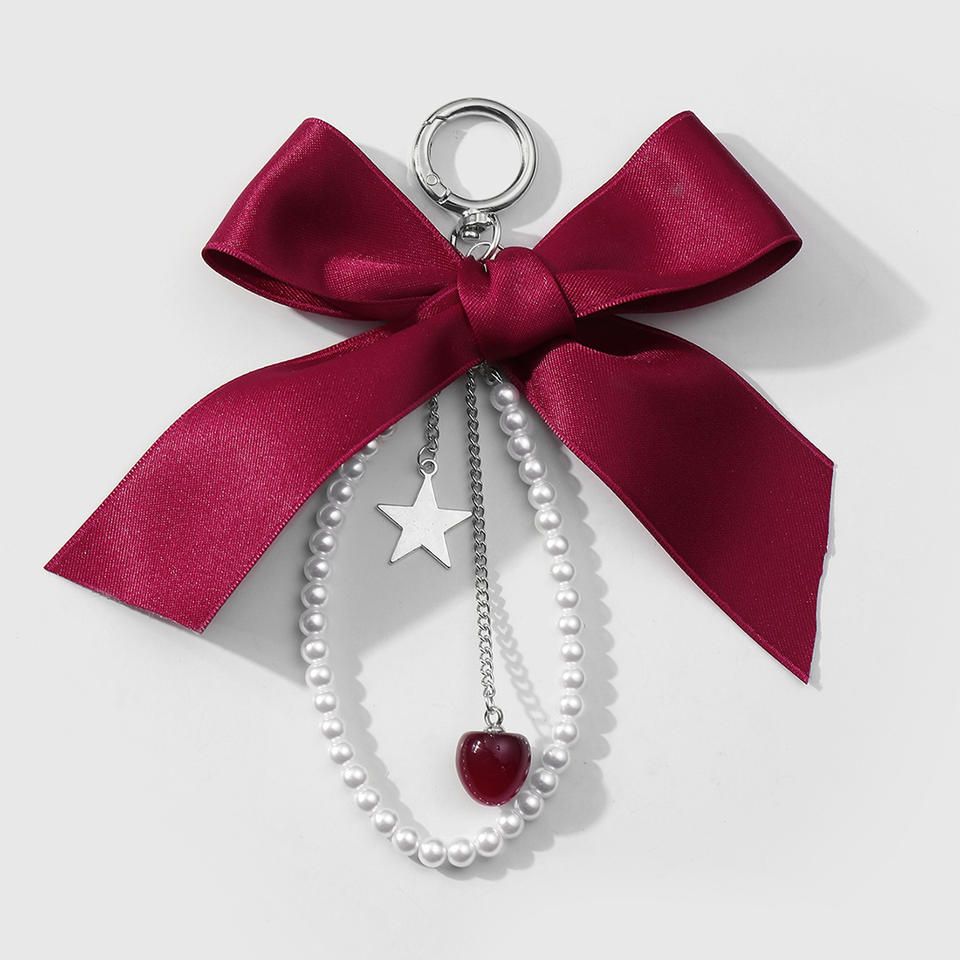 Cross-Border Popular High-Value Wine Red Ribbon Bow Imitation Pearl Cherry Pendant Light Keychain Sweet and Cool Design