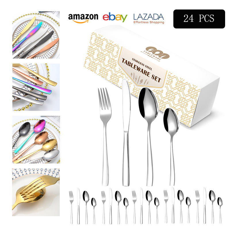 Cross Border Stainless Steel 410 Cutlery 24 Piece Set Square Handle Hotel Western Dinner Knife Fork Spoon Gift Box