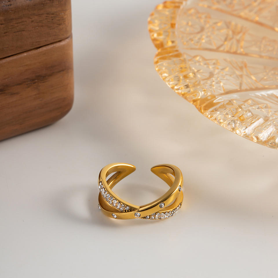 Cross Shape Gold Open Ring With White Diamonds Pave Setting For Women