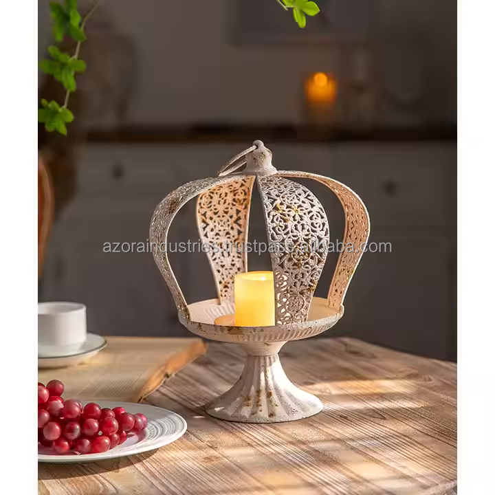 Crown Antique Decorative Metal Light Holder Lantern White Color Candle Holder and Candle Stand for Christmas