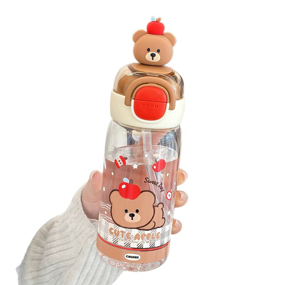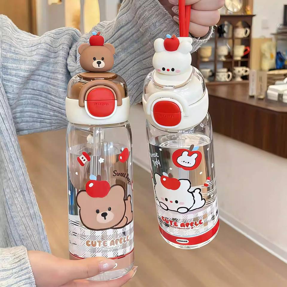 Cruhre Cute Apple Water Bottle 500Ml Dual Straw Kids Student Cup Portable Drink Cup With Lid And Straw