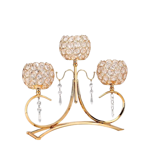 Crystal Bowl Shaped Pit Golden Metal Candle Holder With 3 Arm on Top for With the Sizes of 8.5 Inches Customized Logos Accepted
