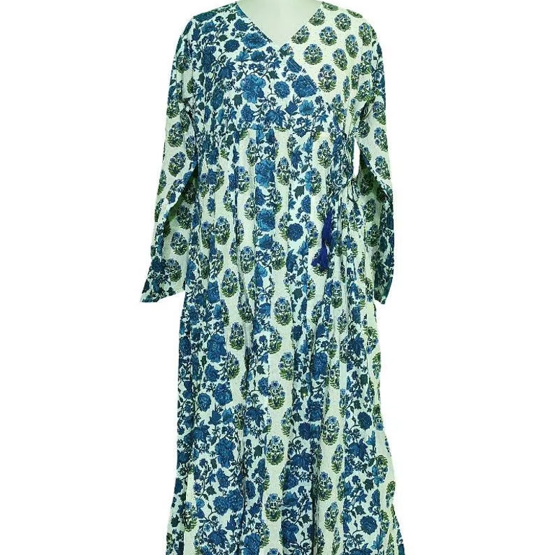 Crystal Cotton Hand Printed Dress 57 Long Floral Print Women s Summer Dress with Indian Block Print & Side Tassels Premium