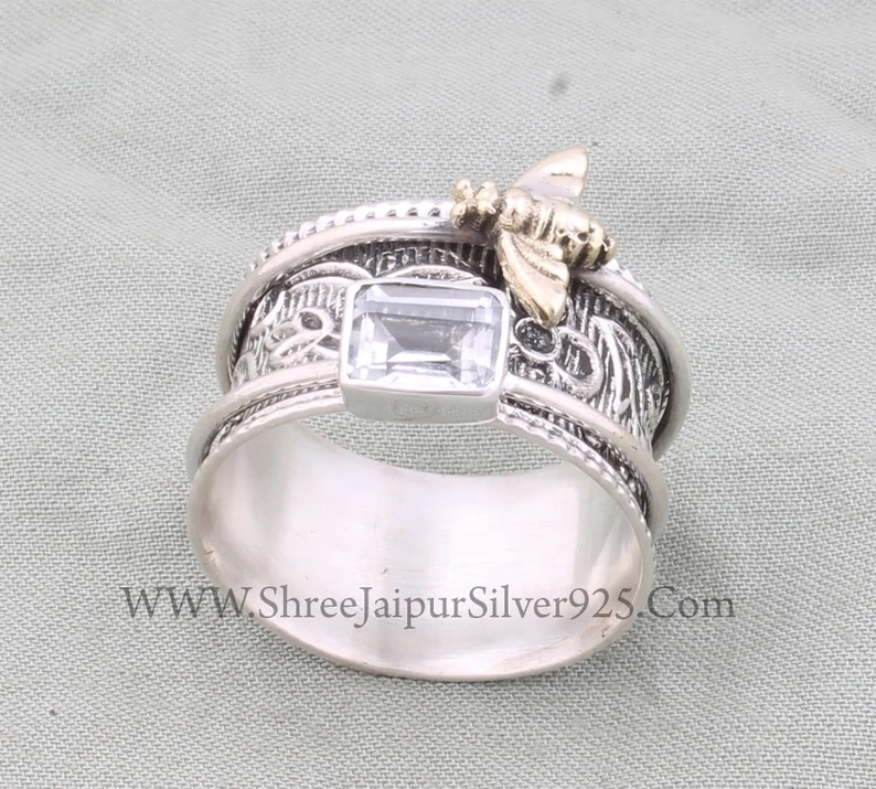Crystal quartz designer carved band small round Sterling Silver & Brass Spinner Ring Boho Meditation Silver Worry Ring For women