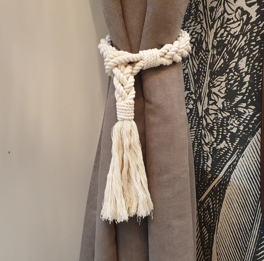 Curtain Tie Back - White Cotton Rope - Weaving From 4 Ropes, Tassel Industrial Holdbacks - Twisted Jute Rope