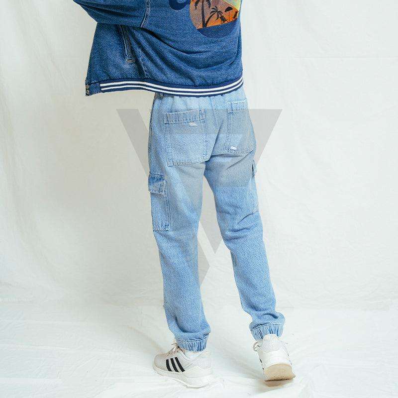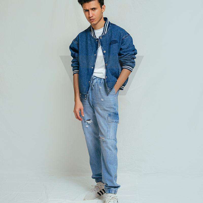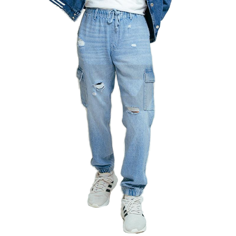 Vintage Blue Cargo Jeans for Men 100% Cotton Denim Distressed Loose Fit Pants Patchwork Design Elastic Cuffs OEM 2025 Fashion