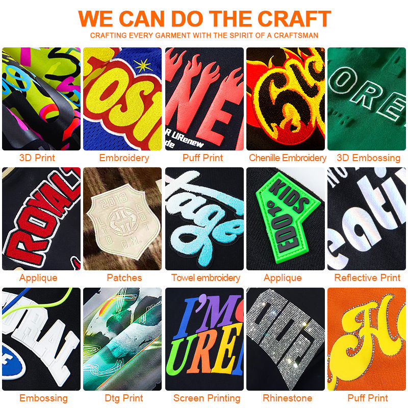 Printing Methods:Tie-dye, Puff Printing, Heat-Transfer Printing, Digital Printing, Silk Screen Printing, silicone printing, reflective printing
