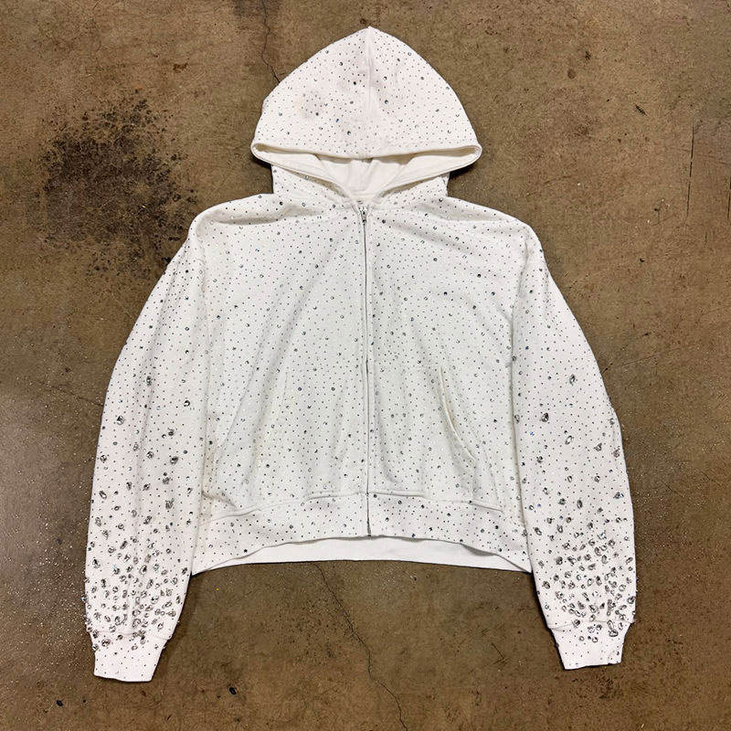 Custom 100% Cotton French Terry Regular Fit Oversized Hoodie with Diamond Zipper and Rhinestone Winter Pullover
