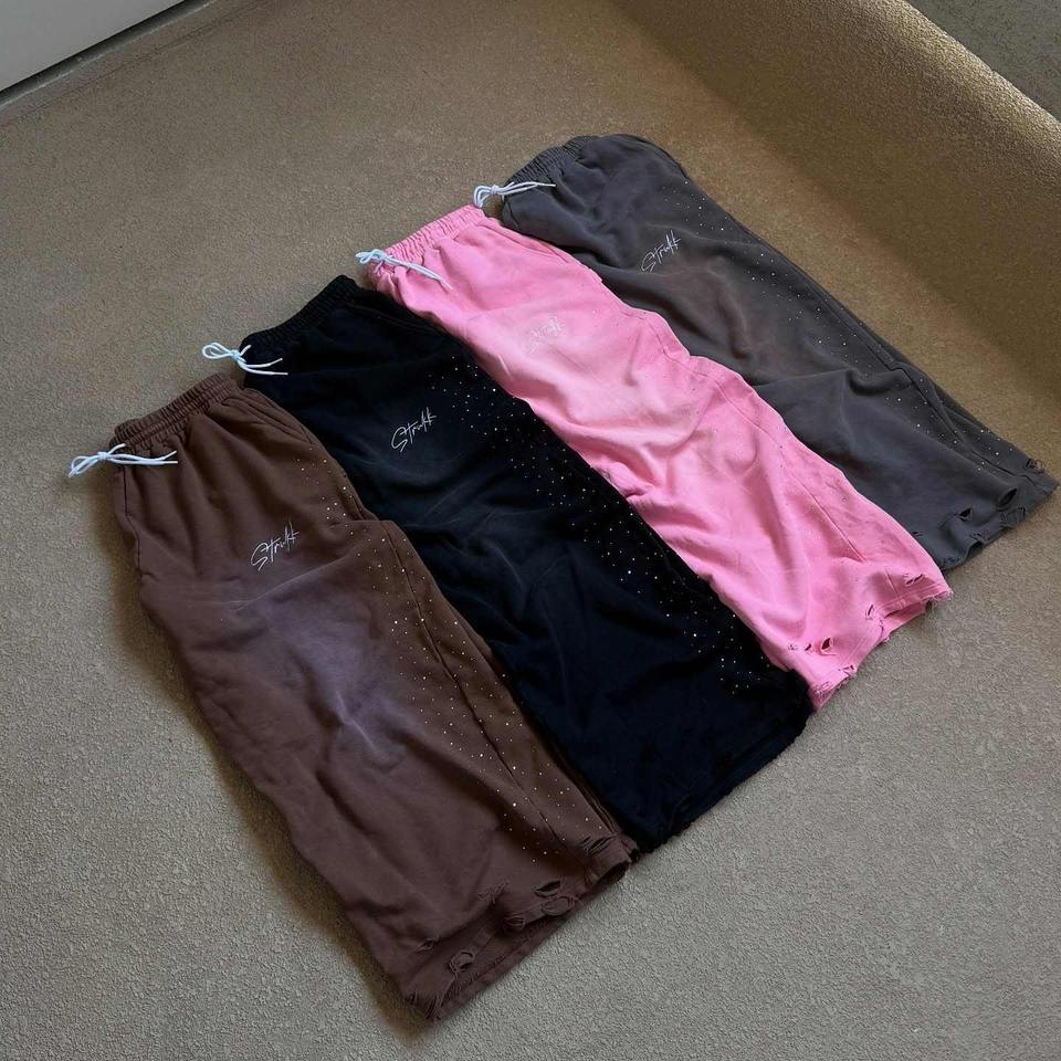 Custom 100% Cotton Heavyweight Vintage Acid Wash Pants Distressed Raw Hem Oversized Stacked Baggy Rhinestone Sweatpants