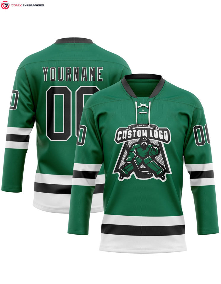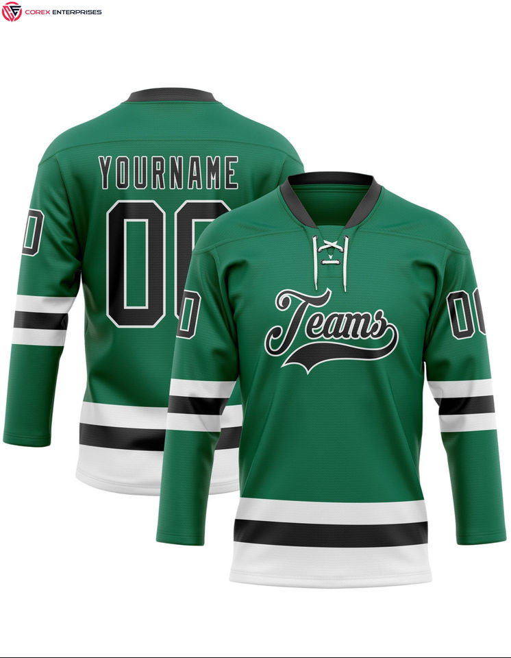 Custom 100% Polyester Jersey with Green & White Hockey Lace Neck OEM Service Available