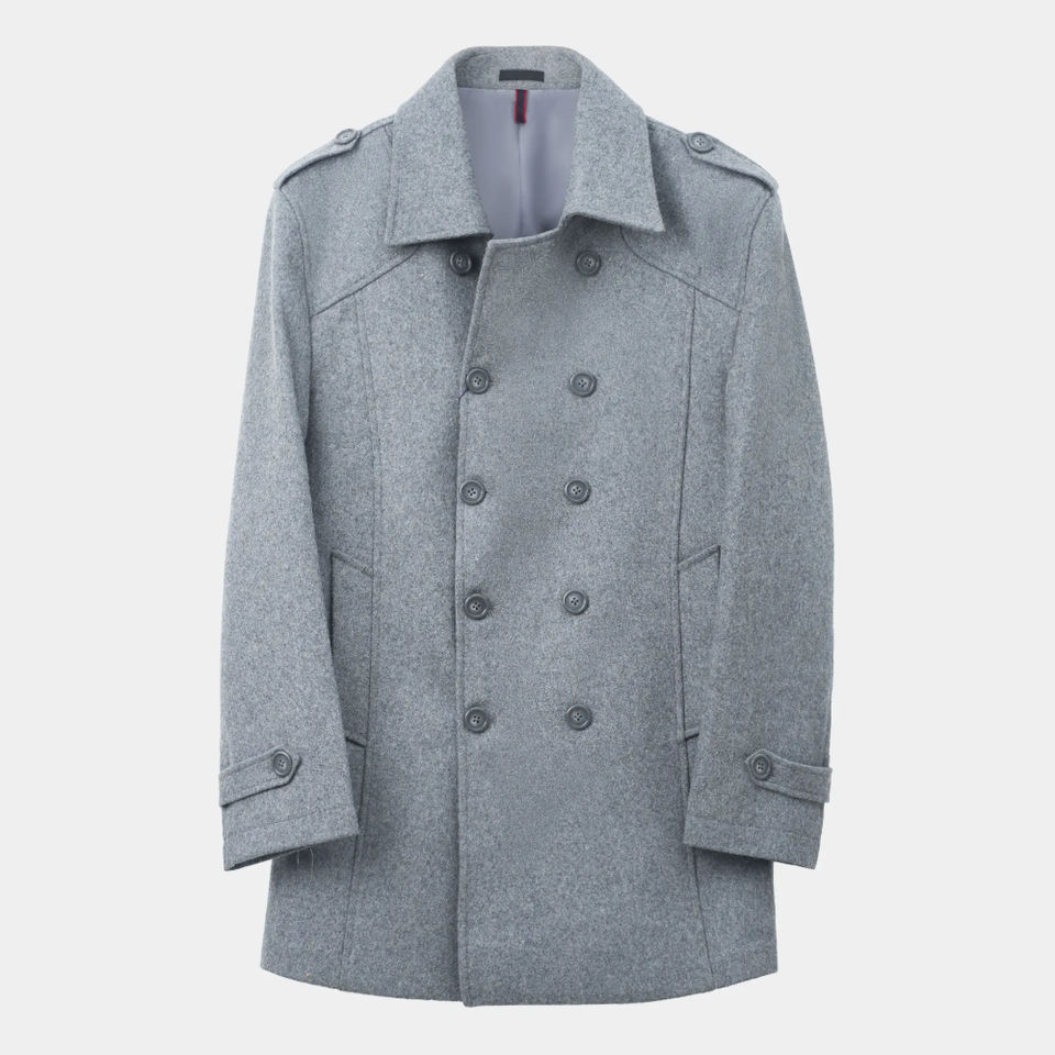 Custom 100% Woolen Men's Peacoat Long Coat High Quality with Real Fox Fur Trim Turn-Down Collar Front Button Grey & Charcoal