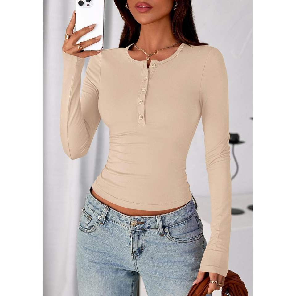 Custom 2025 Fall Womens Casual Long Sleeve Tops Crew Neck Fitted Henley Shirts Basic Tee Blouse for Going Out Knit Outfits