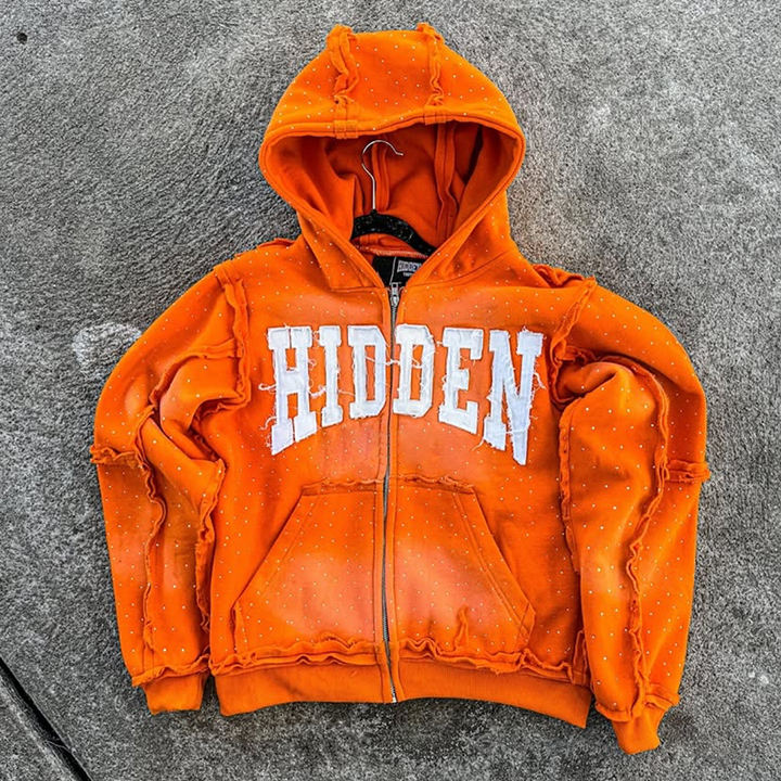 Custom 2025 Streetwear Heavy Weight Rhinestone Hoodie Stitch Patch Distressed Embroidery Vintage Washed Zip up Hoodie