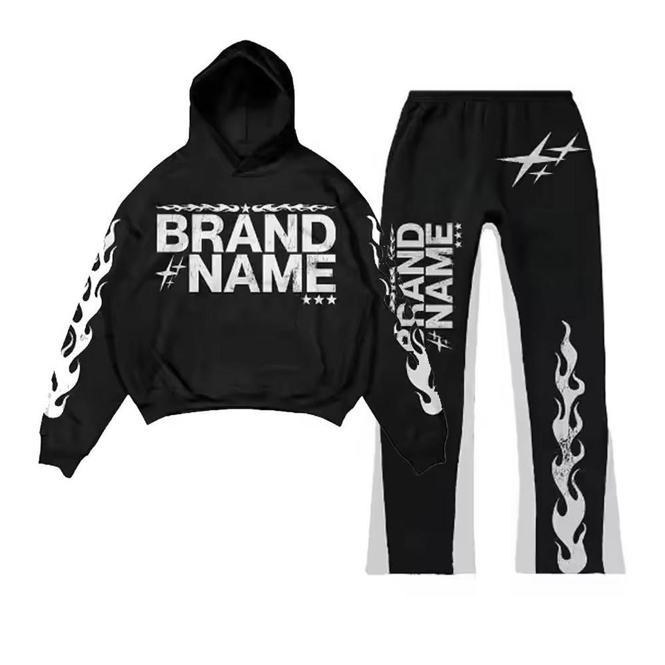 Custom 3d Puff Print Sweatsuits Fleece Flared Sweatpants and Hoodie Set Custom Patch Work Cut Raw Hem Jogger Suit for Unisex