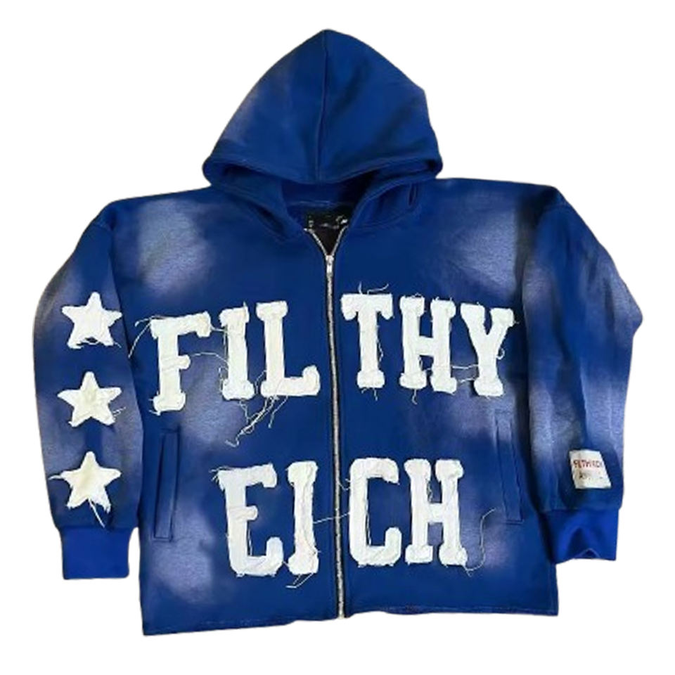 Custom 450 GSM Heavy Weight Zipper Hoodie Raw Hem Vintage Distressed Embroidery Applique Patch Acid Wash Zip up Hoodies