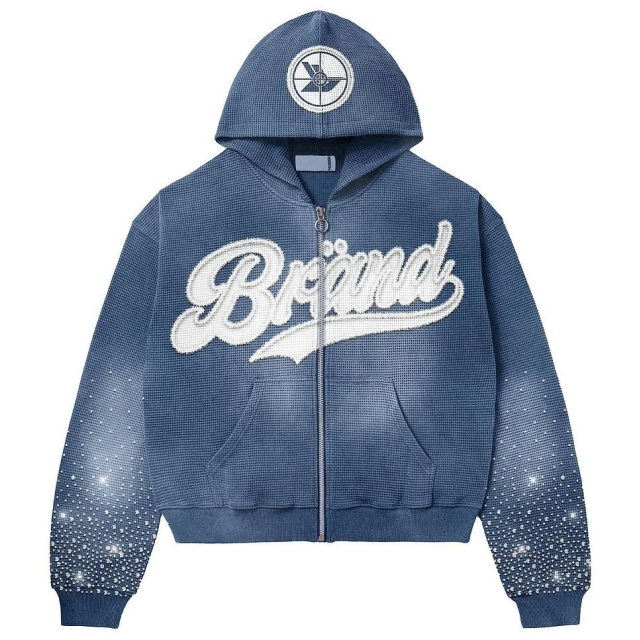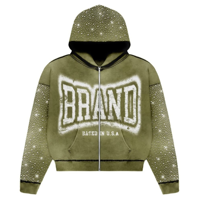 Custom 500 Gsm Embroidered Rhinestones Hoodies Full Zip Hoodies Streetwear Oversized Sun Faded Hoodie