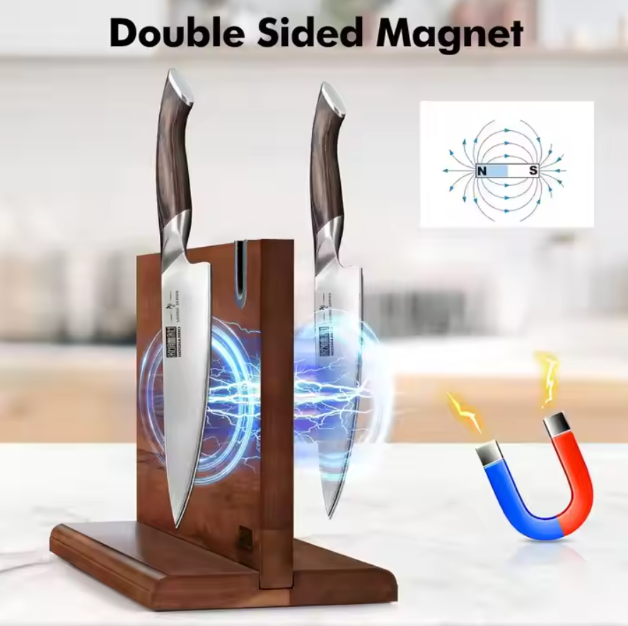 Custom Acacia Wood Magnetic Knife Block with Double Sided Knife Sharpener for Kitchen Counter or Roll Bags