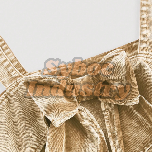 Custom Light Wash Women's Vintage Stylish Denim Overall Jumpsuit with Bib Bow Hollow Back Summer Dress
