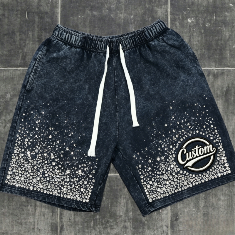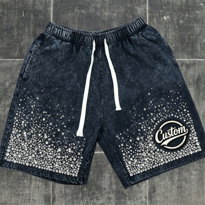 Custom Acid Wash Sweat Rhinestone Mid Waist Drawstring Closure Eco-Friendly Breathable Anti-Wrinkle Shorts Distressed Men