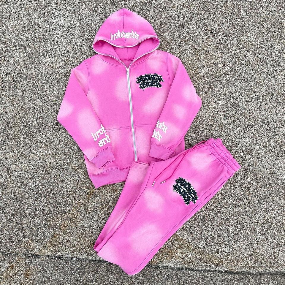 Custom Acid Wash Sweatsuit Jogging Track Suit Set Streetwear Puff Print Spray Wash Flare Sweatpants and Full Zip up Hoodie Set