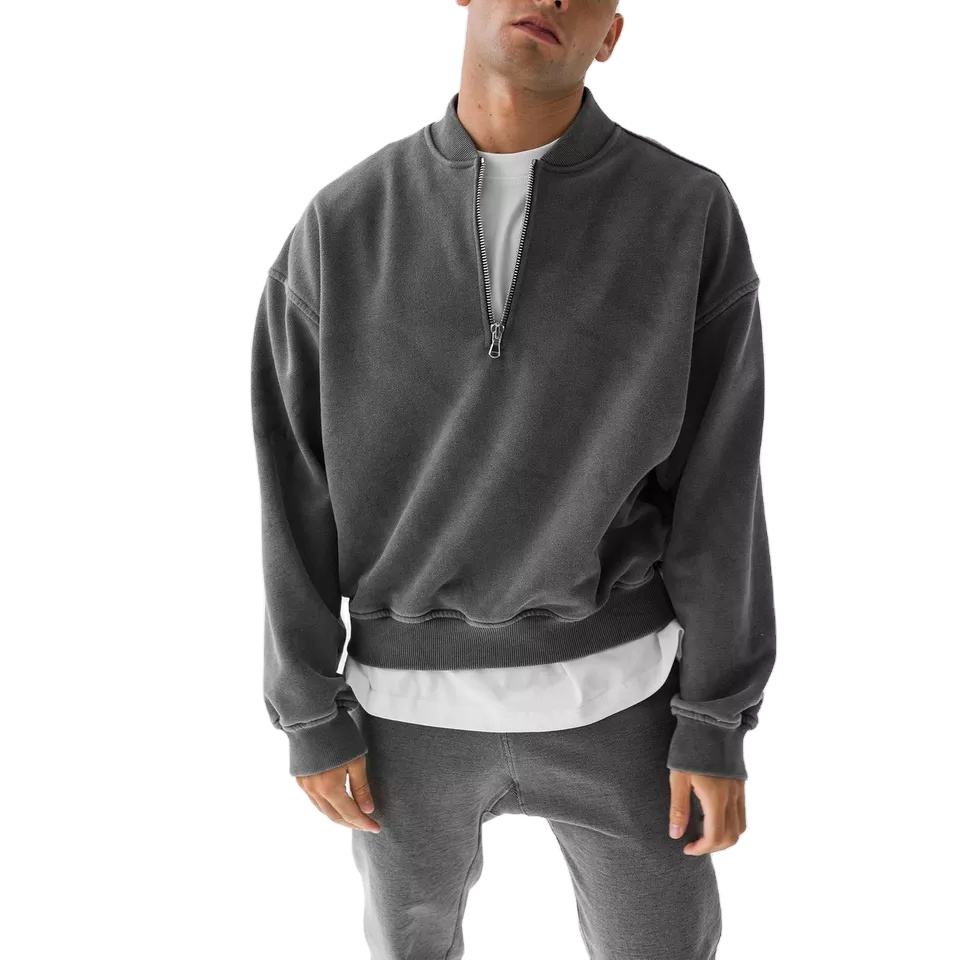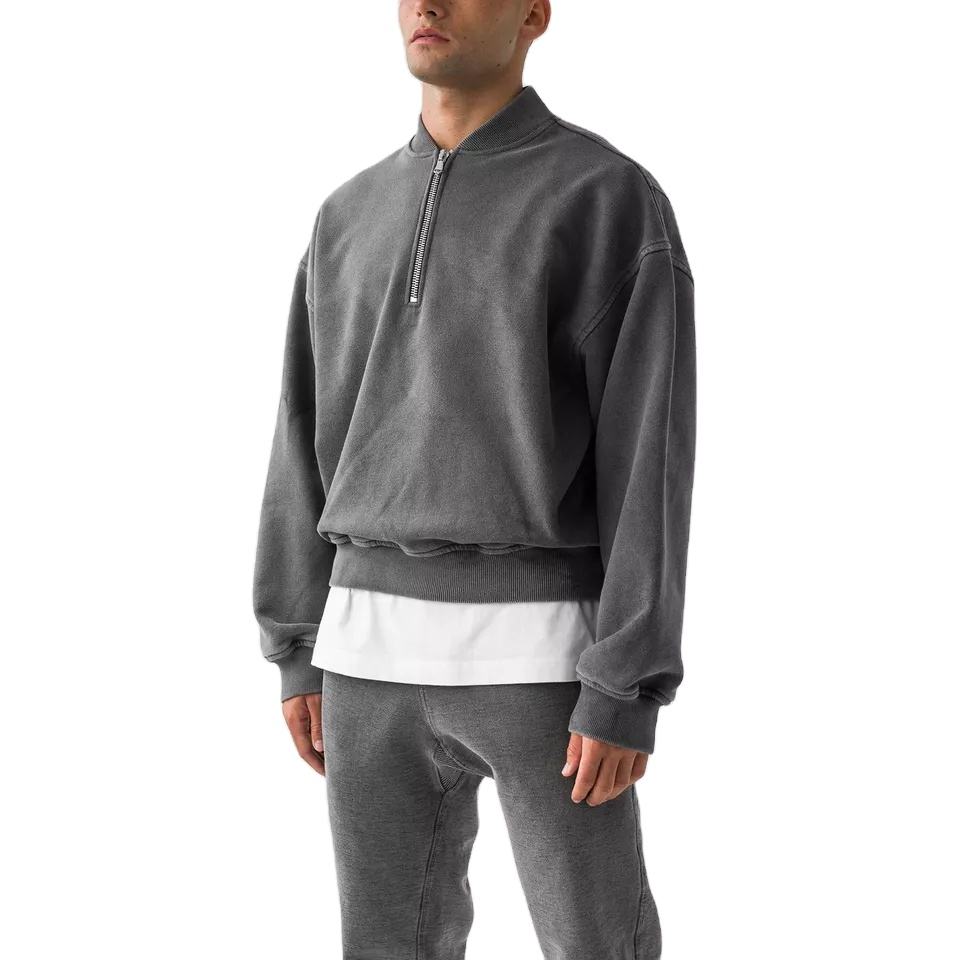 Custom Acid Washed 400GSM French Terry Hoodies Half Zipper Jumper Men 14 Quarter Zipper Sweatshirt Vintage