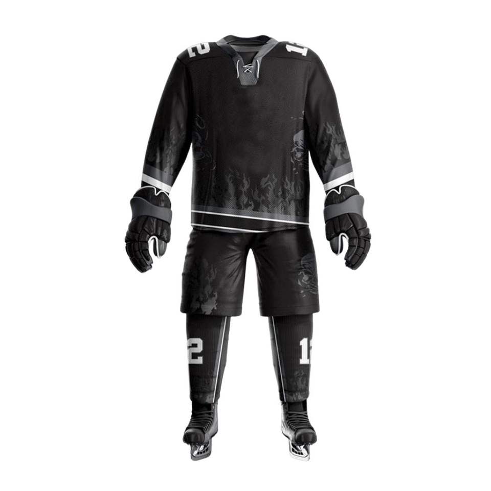 Custom All Black Flame Graphic Sublimated Polyester Teamwear With Name Number Ice Hockey Uniform