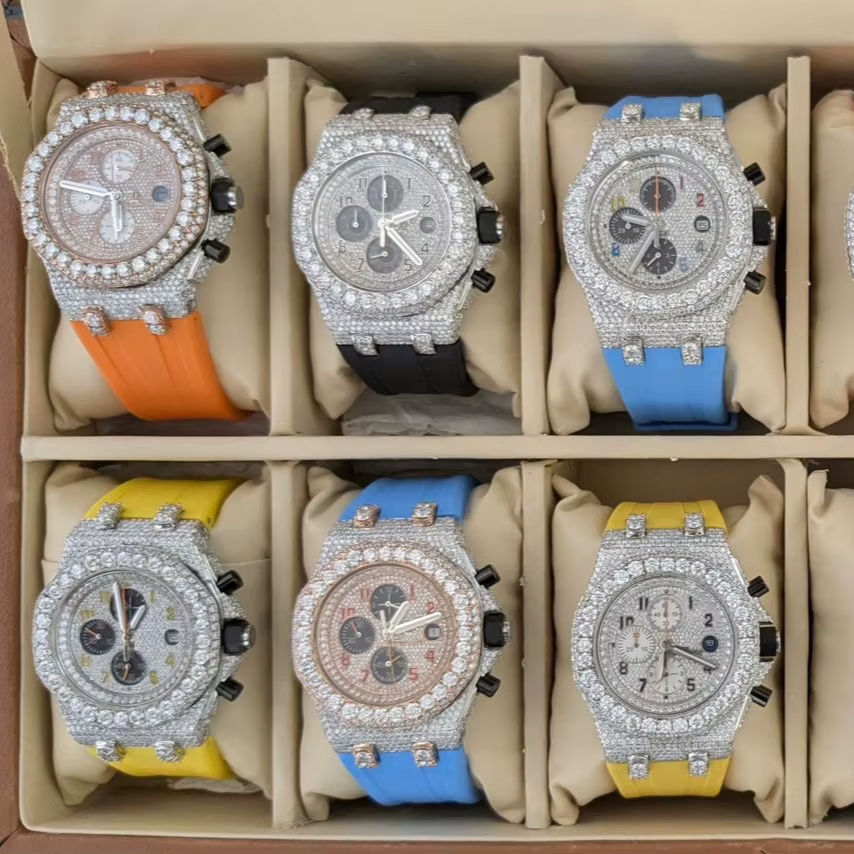Custom for Fully Iced Vvs Moissanite Quartz Watch with Premium Leather Strap Glass Dial Water Resistant for Bulk Orders